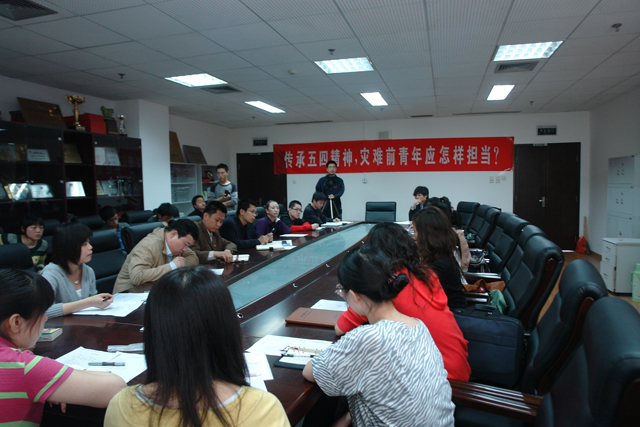 大家热烈讨论了在灾难面前,一部分青年人所表现出的“旁观者”的心态。同学们对于“拔一毛而利天下不为也”的言论进行了理性的思考和分析,材料学院的魏赛同学认为,“五四精神是一种敢为天下先的精神,虽然我们每个人的力量是微薄的,但是在我们的带动下会有更多的人加入到对抗灾难的行动中,青年特别是团学骨干要有能力通过自己的行动有效的引导和带动身边更多的人做正确而有意义的事情。”