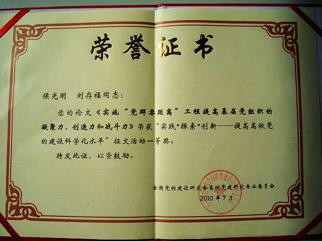 近日,全国党建研究会高校党建研究专业委员会2010年年会在内蒙古自治区满洲里市召开。会上,宣布了“实践•探索•创新---提高高校党的建设科学化水平”征文活动获奖名单。我校党委副书记侯光明等撰写的《实施“党群零距离”工程,提高基层党组织的凝聚力、创造力和战斗力》在119篇参评论文中脱颖而出,被评为一等奖(共有10篇一等奖论文);另一篇论文《在改革中完善,在创新中发展》被评为优秀奖。