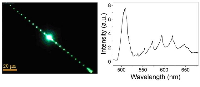在这个工作中,该团队的代国章博士后采用一种简单可控的微区CVD方法实现了一维的光子超晶格结构,主要是II-VI族CdS/CdS:SnS2微米线的生长。这种微米线受光激发后能够产生非常完美的周期性发光,且发光的周期可以通过改变超晶格分段的长度实现调控,光子限域的特征十分完美。其简单的合成方法与材料在光(子)学响应的的结果在国际上首次报道。该成果对降低微型固态激光器的激发阈值、实现新型光波导、光开关,研究激子与光的相互作用具有重要的意义。