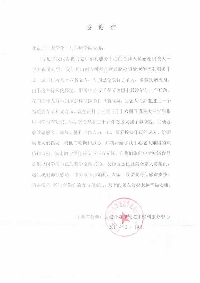 热心公益,奉献爱心——致北理工化工学院的一封感谢信