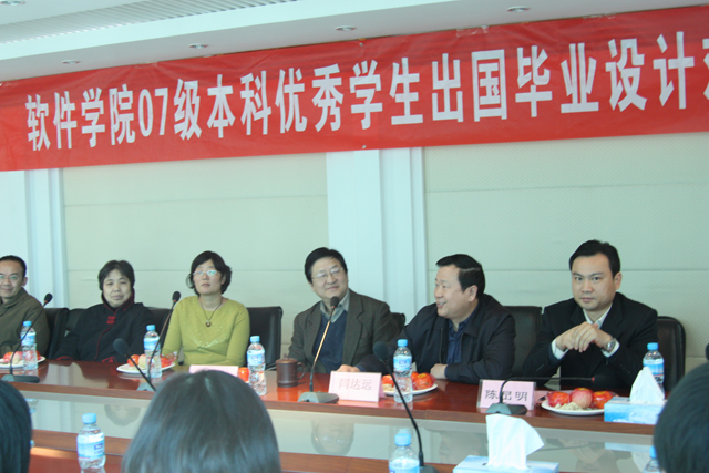3月2日上午10点,软件学院2007级本科优秀学生出国做毕业设计欢送会在软件楼召开。软件学院党委书记李波、副院长闫达远、副书记陈旵明,负责国际交流的赵丰年老师,07级班主任朱玉文老师、商建云老师,负责学生事务的方平老师、柳文艳老师、董大海老师和黄芸老师,以及13名07级出国做毕业设计的优秀同学参加了本次会议。会议由陈旵明主持。
