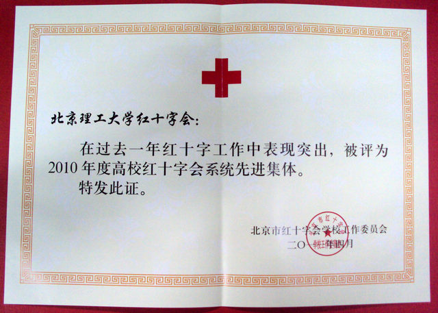 为表彰我校红十字会在过去一年工作中的突出表现,今年4月,北京市红十字会学校工作委员会授予我校红十字会 “2010年度高校红十字系统先进集体”称号。