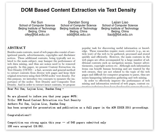 计算机学院独立完成的研究论文:“DOM Based Content Extraction via Text Density”,(硕士生孙飞,指导教师廖乐健、宋丹丹)被第34届国际信息检索年会(ACM SIGIR 2011 Conference,SIGIR—Special Interest Group of Information Retrieval)录用为大会报告及发表全文(presentation and publication as a full paper)。