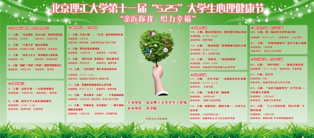 “5•25心理健康节”是我校学生心理健康教育的一项重要内容。今年的心理健康节以“亲近你我、给力幸福”为主题,分为“心理论坛”、“团体辅导”、“身心体验”、“爱心传递”、“爱心奉献”、“感受生活、追寻幸福”、“亲近你我、给力幸福”七大版块,约计20余项主题新颖、参与性强的活动。心理健康节由学生工作处主办、各学院承办。