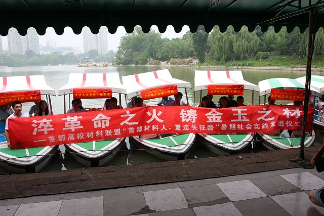 7月12日,由德赢AC米兰官网材料学院发起并组织的大型暑期社会实践活动在紫竹院公园大湖隆重举行。本次主题为“首都材料人,重走长征路”的实践活动有8只队伍共计60余人参与,成员均来自2005年成立的首都高校材料联盟的8所高校,为了纪念六年来首都8所重点高校材料学院结盟的交流与合作,为建党90周年、长征胜利75周年献上材料学子的实际行动,八所高校材料学院均组队出征。