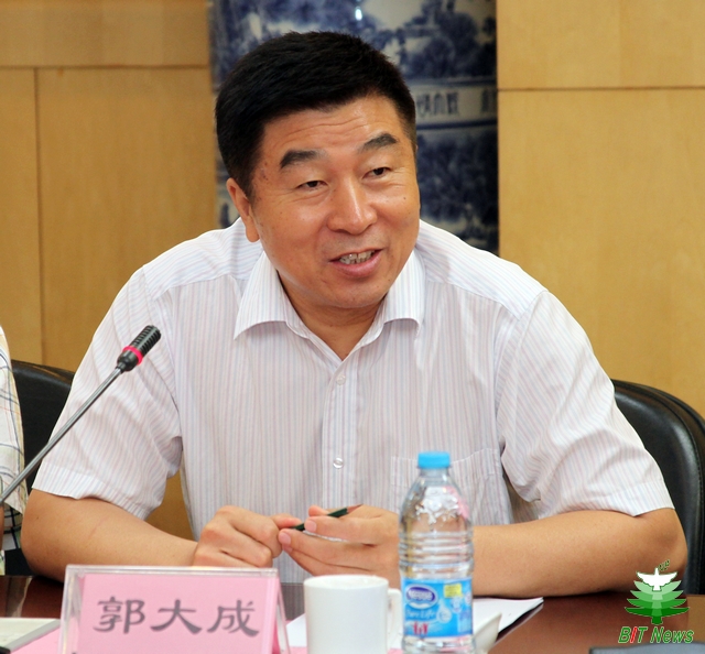 郭大成在讲话中表示学校要积极加强与〇六一基地的合作,各专业学院要与基地的相关单位进行深入交流,在机制体制上探索建立长期合作机制,推动两家单位下一步的交流合作。