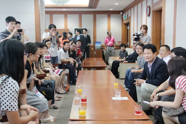 仁川市市长宋永吉(右三)接受中国大学生记者团采访