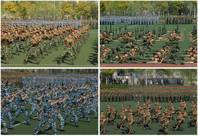 军事科目表演中,由军训旅六个营组成的七个表演方阵,分别进行了捕俘刀、一招制敌、综合格斗术和刺杀操等科目的表演。各表演方阵动作标准,气势如虹。