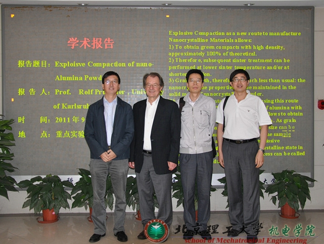 2011年9月13-17日,国际爆轰物理学会前任主席、美国马里兰大学含能材料中心主任Dr. James Short教授、德国卡尔斯鲁厄大学、国际著名爆炸力学专家Rolf Prummer 教授、俄罗斯门捷列夫化工大学化学工程系Sinditskii教授、Serushkin研究员和Yudin副教授等应邀到爆炸科学与技术国家重点实验室进行交流访问。