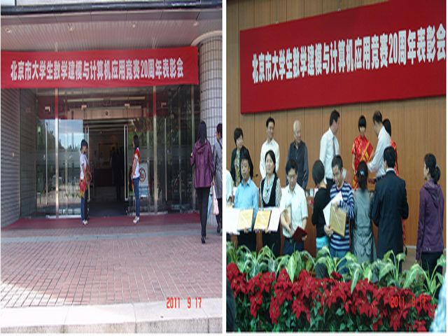 2011年9月17日下午,北京市大学生数学建模与计算机应用竞赛20周年表彰会在北京师范大学举行, 表彰会表彰了20年来在大学生数学建模与计算机应用竞赛的指导、组织活动中涌现出来的优秀指导教师、优秀组织工作者以及优秀组织学校。