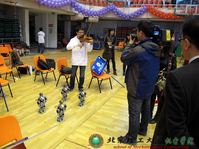 2011年10月12日上午11点,精彩纷呈的机器人多人舞拉开帷幕,我校机器人多人舞表演的主题为“和”,机电学院机械电子工程专业葛卓同学的小提琴现场演奏为机器人舞蹈配乐,体现了“人机关系之和”;中俄两国四首不同特色舞曲的混编,演绎了“国际关系之和”;各大高校机器人代表队的同台竞技,展现了“校际关系之和”。如此独具特色的表演编排,在众多参赛队的舞蹈中独树一帜,得到了其他参赛队员和现场观众的高度赞扬,取得了此项目第三名的佳绩。