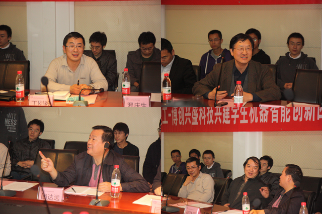 接着,校团委副书记高博、教务处明道福、机电学院机器人专家罗庆生、软件学院丁刚毅教授、北京博创兴盛科技有限公司总经理王野等领导和老师积极发表意见,对创新团队的发展给予指导和建议,并表示了将继续给予大力扶持和帮助。