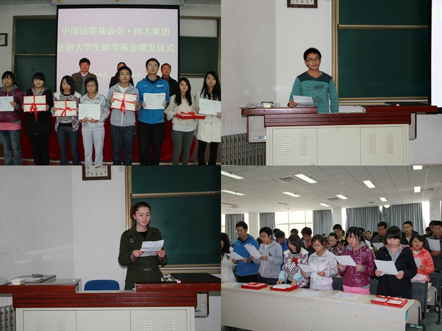 孙文龙宣读了2011年度中国扶贫基金会•恒大集团贫困大学生助学基金获助学生名单。轩海彬等50名2011级学生获得3000元助学金。