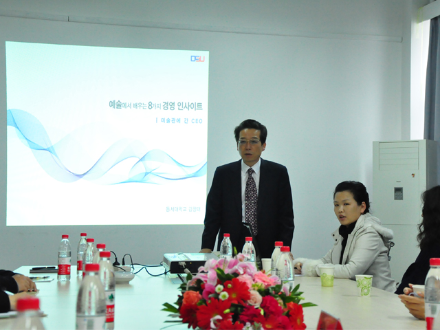 下午2点,韩国东西大学的老师在中心教学楼1124会议室给学生带来了精彩的学术讲座。徐其敏副院长主持了讲座,首先,金昌大院长介绍了艺术在企业、生活中的应用。他提出了创造经营的概念,分析了创造经营与艺术的关系,并用实例给我们进行了展示。他认为洞察力和观察力对于企业非常重要,独特的创新思维是艺术家设计师的基本素质。