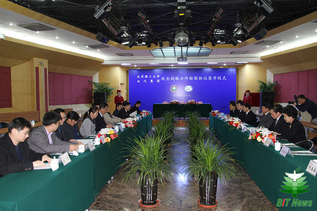 郭大成在致辞中首先代表学校对北汽集团各位领导的到来表示热烈欢迎,向来宾介绍了学校的办学历史、办学成就以及办学理念,表示学校将继续坚持“立足国防,面向全国,服务地方”的定位,积极服务北京市发展建设,特别是继续深化与以北汽集团为代表的业内领先企业之间的合作共建关系,希望双方战略合作框架协议的签署能够开启双方合作的美好前景,搭建更加广阔的合作平台,能够在科研技术攻关、科技成果转化、人才培养、学术交流以及教学实践等方面开展全方位、深层次的交流合作。