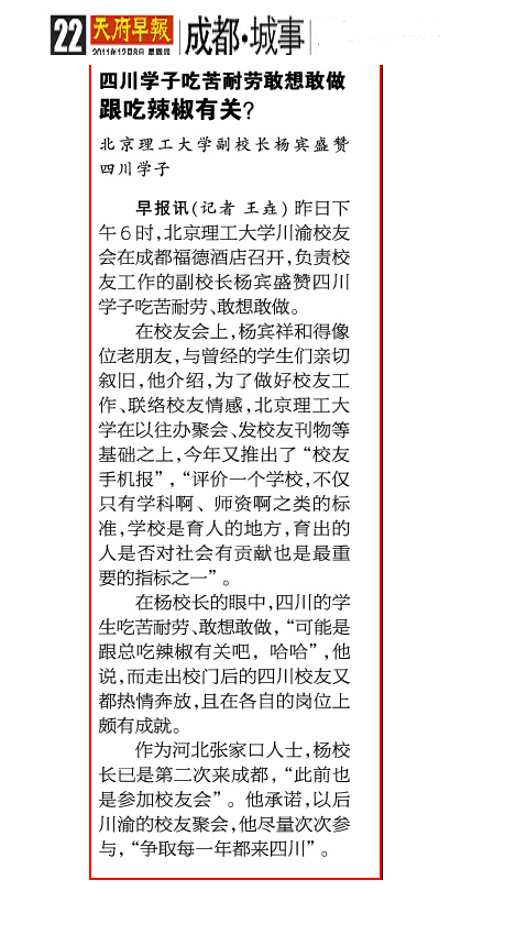 附:12月8日出版的《天府早报》以《四川学子吃苦耐劳敢想敢做跟吃辣椒有关?》为题,报道了学校副校长杨宾对四川学子的盛赞。杨宾向记者介绍道,为了做好校友工作、联络校友感情,德赢AC米兰官网在以往办聚会、发校友刊物等基础之上,今年又推出了校友手机报。杨宾说,在他印象中,四川学生吃苦耐劳,敢想敢做,而走出校门后的校友又都热情奔放,且在各自的岗位上颇有成就。