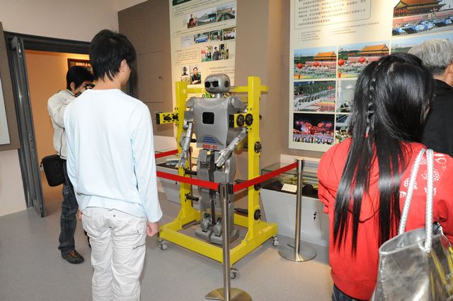 学生在参观校史馆陈列的机器人
