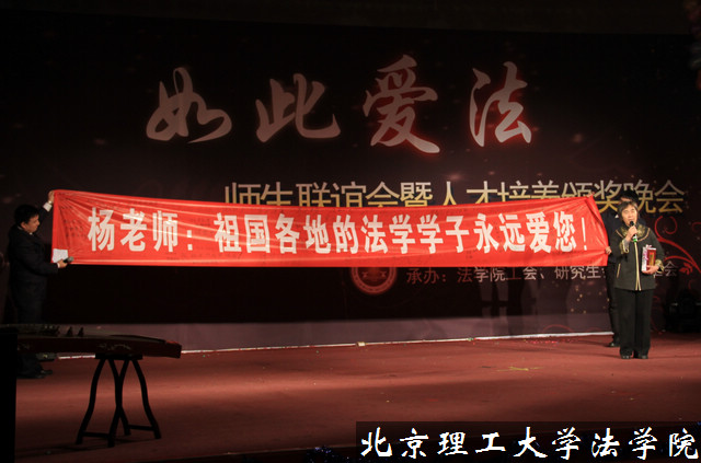 在这一篇章中,法学院副教授李艳秋以“李派清口”的形式为大家讲述自己在授课中发生的趣事——《我们的欢乐岁月》。法学院1995级毕业生李铮校友则为大家演唱了《智取威虎山》中的《共产党员》唱段,博得满堂喝彩。配乐书法《我爱我师》,表达了同学们对老师们的尊敬与热爱,并将该幅清秀隽永的书法送给了获得法学院“我爱我师”奖的李金明老师。刘毅老师则获得了“思想之师”奖,他所创办的“法学读书会”每次都座无虚席。孟强老师的陶笛独奏《天空之城》更是深受观众喜爱,而由2011级本科生曾琦璟带来的舞蹈《红豆》引出的“终身之师”奖则将整台晚会推向高潮。送给深受历届法学学长爱戴的杨亚非老师的礼物是一条由所有到场的300多名学生签名的印有“杨老师,祖国各地的法学学子永远爱您!”的条幅。杨亚非老师即将退休,在她几十年的教学生涯中,一直用“勤奋”与“爱心”辛勤耕耘着,不仅治学严谨,取得了丰硕的学术成果,而且对学生以慈母般的关怀,深受同学们爱戴。“辛勤耕耘数十载,园丁未老鬓先白,脉脉温情慈母心,谆谆教诲严师爱,点石成金三尺台,春风化雨桃李开,筚路褴褛奠基业,饮水思源莫忘怀”,当主持人念出杨亚非老师的颁奖词时,全场响起了经久不息的热烈掌声,现场更有多位老师、同学感动落泪。