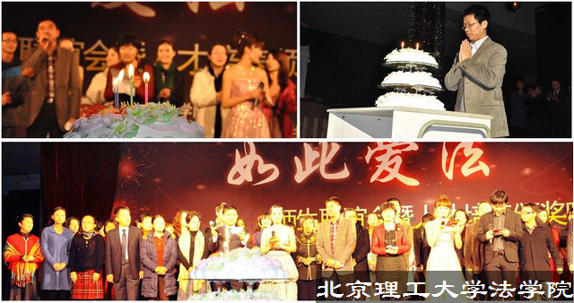 为系统总结表彰一年来法学院人才培养工作取得的成绩、增进法学院师生感情、喜迎2012年的到来,法学院于2011年12月30日在中关村校区新食堂四层举办了以“如此爱法”为主题的师生联谊会暨人才培养颁奖晚会。法学院院长曲三强、党委书记徐强,副院长李寿平、张艳丽、党委副书记副院长张巍等学院领导同法学院师生、校友一起参加了颁奖晚会。