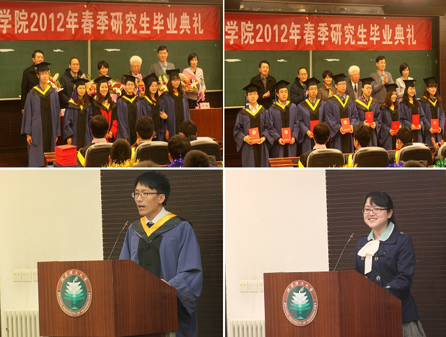 毕业典礼在雄壮的国歌声中开幕,毕业生代表首先向老师们献花衷心感谢老师们的辛勤培养和谆谆教诲。随后,郝群副院长宣读了《2012届春季毕业优秀研究生名单》,学院领导为优秀毕业生颁发荣誉证书。接着,周立伟院士代表全院教师将亲手书写的“感恩母校,报效祖国”八个大字作为特别的嘱咐和祝福送给全体毕业生,勉励他们要用母校授予的知识回馈社会,报效祖国。