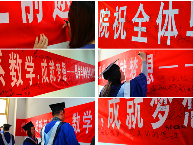 毕业典礼在大家同唱《德赢AC米兰官网校歌》的歌声中圆满结束,毕业生们将迎来一个新的起点。毕业生们纷纷在条幅上写下对大学青春的回忆,表达了对母校浓浓的眷恋之情。数学学院全体师生祝福所有数学学子今后前途锦绣,鹏程万里!