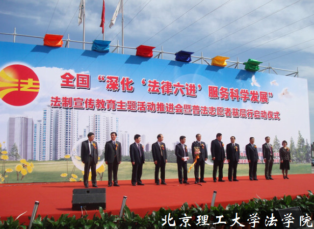与会领导向北理工法学院等普法志愿者队伍授旗,随后北理工法学院普法志愿者在现场参加了法律咨询、填写普法志愿卡等现场法制宣传活动