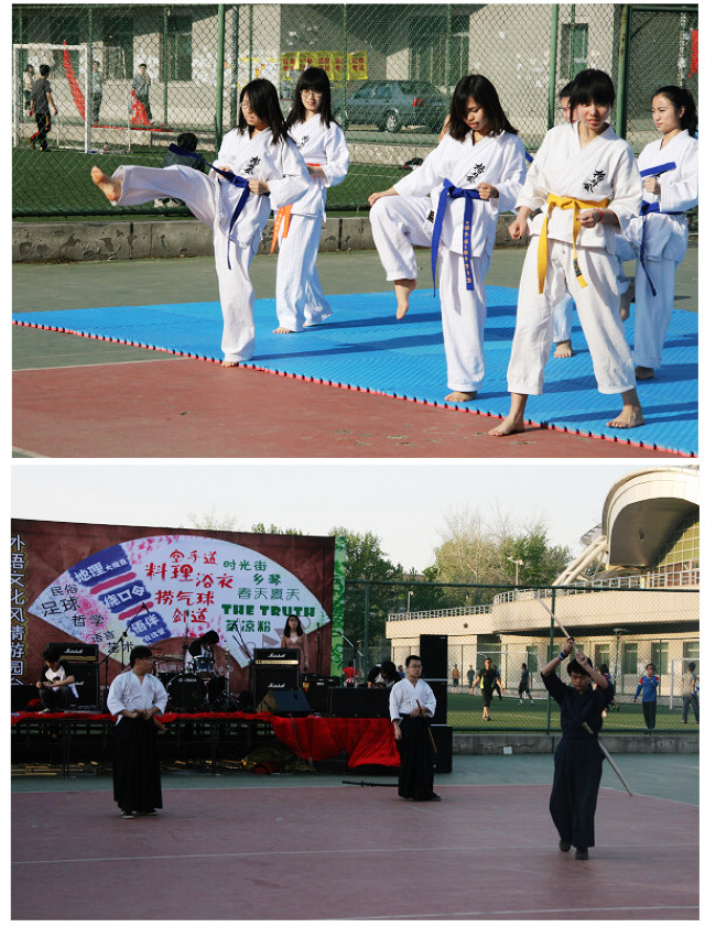 舞台周围,分布着外语活动区、社团表演区和游戏区。在外语活动区,同学们可以到英语活动区的英语角与外国留学生交流,也可以到德语活动区与德国外教交流、品尝德国啤酒和三明治,还可以到日语活动区跟随日本外教学习折纸、试穿和服、免费观看各种日本漫画。在不同的外语活动区都穿插着各种小游戏环节,同学们可以通过做游戏收集印章,集齐一定数量的印章便可以免费到服务台领取各色小礼品。在社团表演区,来自空手道协会和剑道社的同学为大家表演了精彩的空手道和剑道节目。