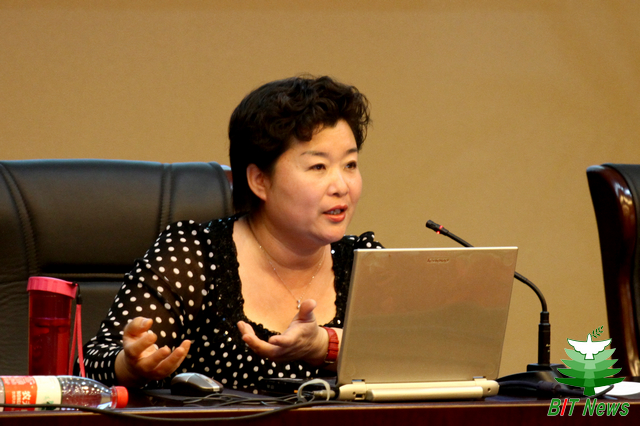 姜金凤以《勤恳做事,踏实做人,平凡中彰显不平凡的人生——回忆李盼兴在后勤集团工作的点点滴滴》为题,从李盼兴同志生平简介讲起,她用一幅幅图片回忆了李盼兴同志在担任后勤集团党委书记期间深入一线,战非典。在迎新现场、在抢修工地与职工们一起摸爬滚打、同甘共苦的场景;回顾了李盼兴同志为后勤作出的突出贡献。用生动的事例诠释了李盼兴同志的优秀品质:一是厚德博才,睿智敬业;二是清廉、奉献、务实;三是胸襟宽阔,大爱于心。李盼兴同志的优秀品质使现场的很多同志肃然起敬。