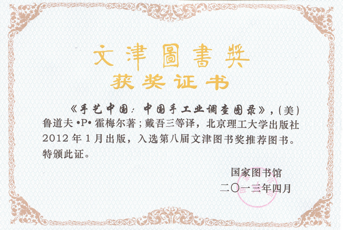 第八届文津图书奖获奖结果于2013年4月23日在国家图书馆学津堂举行的“书香中国 阅读让人生更美好——4.23世界读书日优秀图书推介活动”上公布,《资中筠自选集》、《论中国》、《落脚城市》等书获此殊荣。德赢AC米兰官网出版社2012年1月出版的《手艺中国:中国手工业调查图录》入选本届文津图书奖推荐图书。