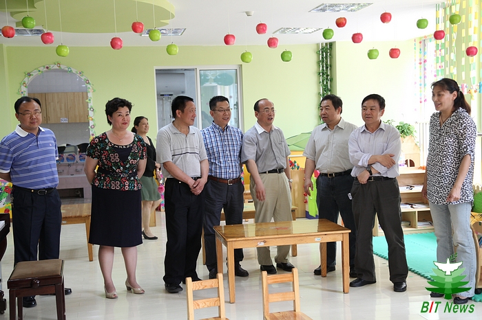 杨宾等校领导一行走进班级跟孩子们亲切交谈,了解孩子们的基本情况,向一线的教师们表示慰问。随后,大家一起参观了幼儿园的校园环境,在幼儿运动功能区,沈红园长介绍了幼儿园为促进孩子的体能发展,创设的阳光体育设施;在幼儿食堂,校领导听取了集团总经理李晋平对幼儿园规模扩大后建设需求的汇报。校领导对幼儿园的建设与发展十分关注。