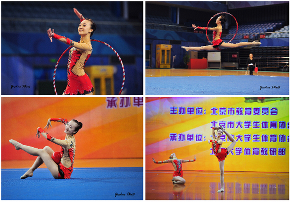 二级赛的争夺异常激烈,来自清华大学、北京语言大学、北京师范大学的多名选手都在本赛事中有着丰富的经验。但是随着赛事的推进,比赛逐渐成为了我校首次参赛的雨童同学和清华大学赵博之间的对决。起初,雨童在圈操的表演中,并没有将状态调整到最佳,以0.1份落后于清华大学的赵博。随后的两次出场中,雨童越战越勇,在带操、球操中均获得最高分并取得了明显的优势,最终雨童获得了二级赛绳操、带操的冠军,圈操亚军,并以总成绩的优势获得全能冠军。