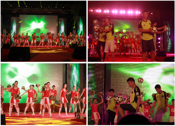 由管理与经济学院同学们表演的《加油!北理工》表达了所有理工人的“足球情结”,特别是节目中,卢斌等球队主力球员突然出现在舞台上,将手中的签名球抛向观众,这一意外的惊喜,将晚会推向一个新的高潮。