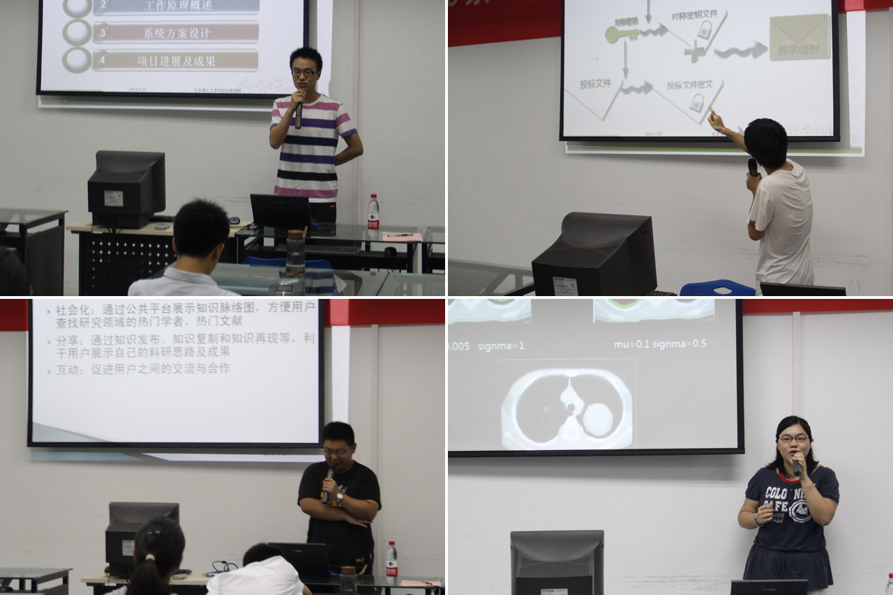 表彰大会上,部分优秀创新项目团队代表通过PPT展示了集训以来所学的知识, 取得的进展,遇到的困难和今后前进的方向,大家相互交流学习的同时也给低年级同学做了专业入门的指导。接着12级学生代表商占仝、11级学生代表做了集训心得的交流;09级ACM集训队队员梁耀波代表介绍了自己的奋斗历程和出国参赛的见闻感受。刘贺老师就集训各项工作作了总结汇报。