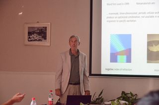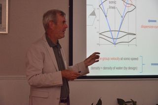 Norris教授的报告首先介绍了声波的变换方法,详细讲解了通过各向异性密度和使用pentamode材料两种途径对声波cloak的设计。随后又深入介绍了一种pentamode材料-------金属水。通过对金属泡沫的设计可以得到和水具有相同的声速和阻抗的固体材料,这类材料在实现声波隐身,负折射和超透镜方面有很好的应用前景。