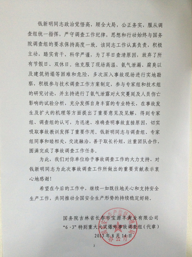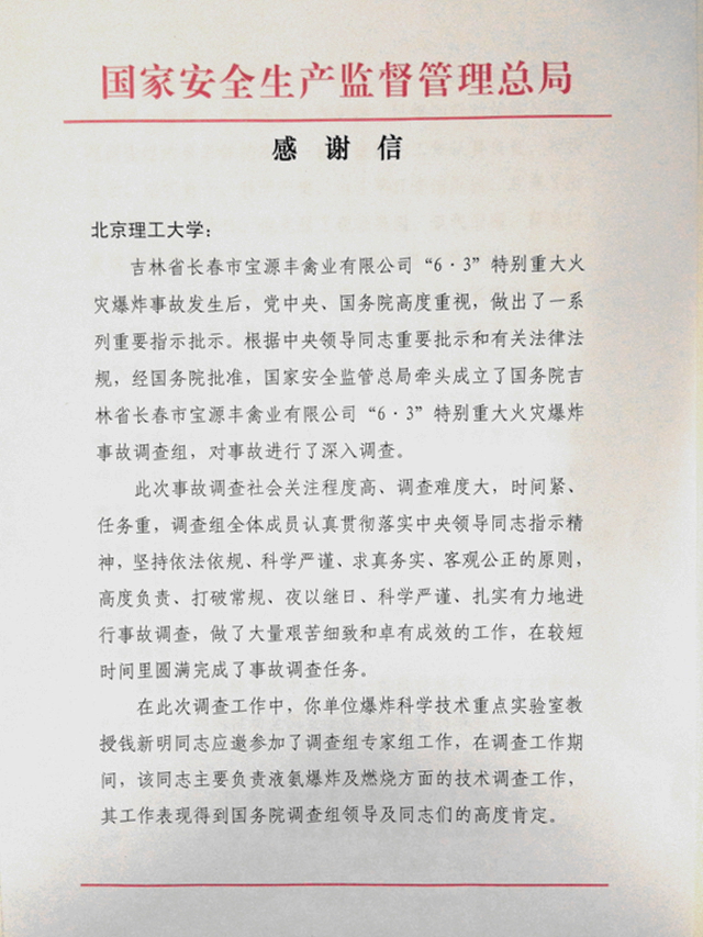 吉林省长春市宝源丰禽业有限公司“6.3”特别重大火灾爆炸事故发生后,党中央、国务院高度重视,做出了一系列重要指示、批示。在此次调查工作中,德赢AC米兰官网爆炸科学技术重点实验室教授钱新明同志应邀参加了调查组专家组工作,在调查工作期间,主要负责液氨爆炸及燃烧方面的技术调查工作,其工作表现得到国务院调查组领导及同志们的高度肯定。