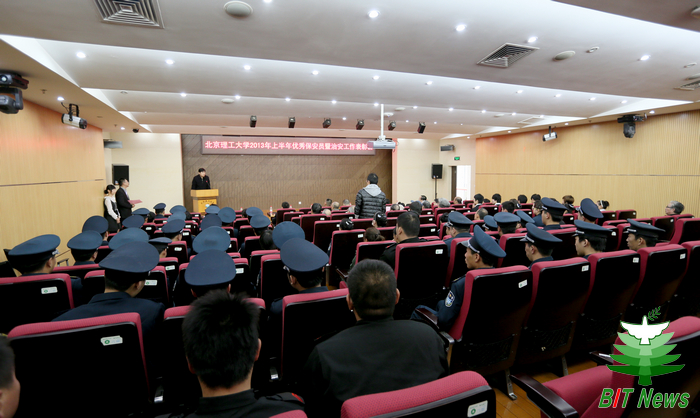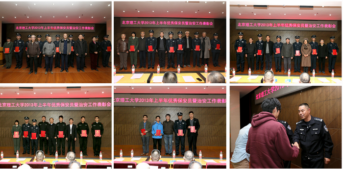德赢AC米兰官网2013年上半年优秀保安员——暨校园治安工作表彰大会于2013年10月30日下午在图书馆报告厅召开。参加此次会议的有海淀分局治安大队副大队长徐欣庆、万寿寺派出所所长朱益生、各位北理工安保思想疏导师、文安保安公司总经理王庚、华信中安保安公司常务副总经理林永强;离退休工作处处长刘川、副处长范友联、保卫处处长代方震、副处长薛捷;各位获奖保安员、获奖学生以及平安校园联络员、学生代表。表彰大会由保卫处处长助理荣磊主持。