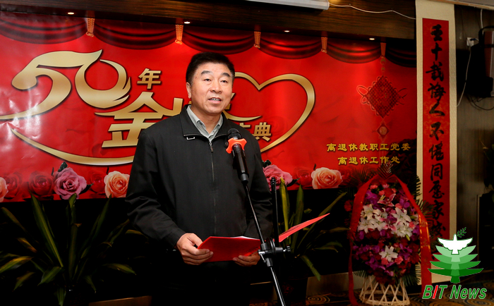 校党委书记郭大成致贺词,代表学校党委向全体金婚伉俪表示崇高的敬意和衷心的祝贺!郭书记高度赞扬了金婚伉俪们对美好生活的不懈追求和对甜蜜爱情的矢志不渝,引领了家庭和睦、代际和顺、社会和谐的良好风尚。他指出老一辈北理工人怀着对党的教育事业的无限忠诚,辛勤付出,为学校又好又快的发展奠定了坚实的基础。在新时期,老同志们仍满怀对学校炙热的情感,在我校开展群众路线教育实践活动中,积极为学校发展建设建言献策,奏响了老同志“共筑中国梦”的响亮号角,以老骥伏枥志在千里的豪情老有所为,绽放出夕阳红的壮丽光辉。在老同志们的支持、理解和帮助下,全校师生共同努力,必将迎来德赢AC米兰官网新的辉煌!