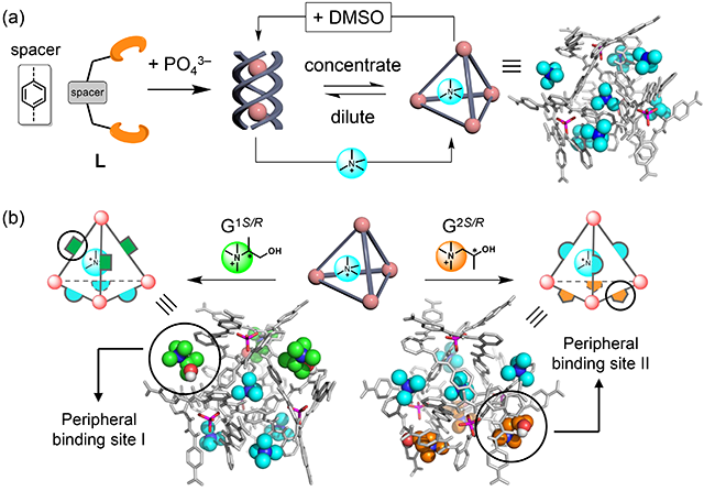 基于三螺旋组装体的研究,增强双二脲配体结构的刚性和线形,苯基片段连接的双二脲配体在磷酸根离子诱导下可组装形成四面体笼。该组装结构表现了模板、浓度和溶剂依赖性( ACIE 2018, 57 , 1851)。四甲基铵阳离子可作为内外模板离子,稳定四面体笼。有趣的是,笼外围凹槽同样可镶嵌铵根阳离子,并呈现了意想不到的“对称破缺性”( JACS 2020, 142 , 6304)。结构相似的异构体(α-甲基胆碱G1 S /G1 R 和β-甲基胆碱G2 S /G2 R )能够沿着笼的两种边缘(外围结合位点I和II)选择性结合,产生不同的手性诱导效应(图4)。此类对称破缺性可能源于四面体构型的磷酸根离子配位中心。将连接子基团从单苯扩展到联苯,得到了空腔更大的四面体笼以及具有96个氢键的A8L12双帽反三棱柱结构,这是目前报道的氢键数目最多的离散组装结构( JACS 2020, 142 , 21160)。偶氮苯片段桥连的双二脲配体形成的四面体笼能够封装18冠6分子结合的四甲基铵根离子( ACIE 2022, 61 , e202201789)。