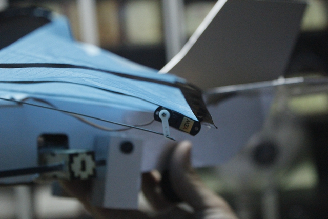 当然,作为一款飞行器,不能总是在地上爬行,而为了实现地面高效爬行能力和隐蔽能力,一双过于“招摇”的大翅膀是不可取的,最终设计团队还是向昆虫“拜师”,“求得”了一双可折叠的柔性翼,这样设计不仅使飞行器便于携带,同时在地面机动时可以减小飞行器的尺寸,便于通过狭窄的空间。