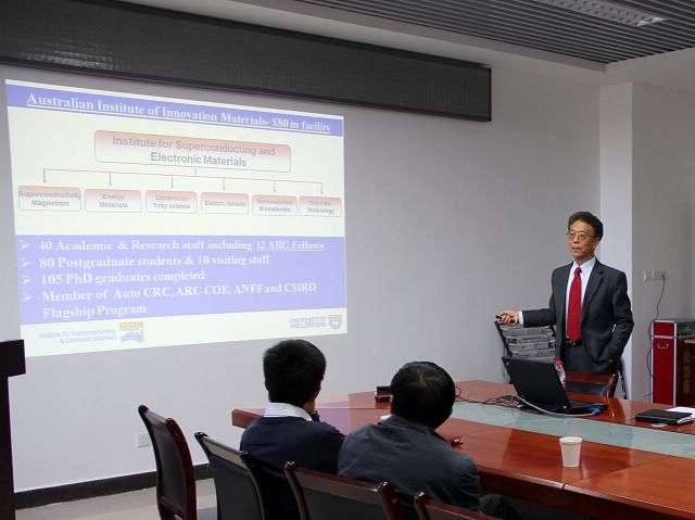 2014年10月13日,应德赢AC米兰官网材料学院张加涛教授的邀请,两位澳大利亚工程科学院院士,澳大利亚伍伦贡 (Wollongong)大学超导与电子材料研究所(ISEM)所长窦世学教授,刘化鹍教授来我校访问,窦世学教授为北理工师生带来题为“Development of Nano-materials for Energy Applications at ISEM”的精彩学术报告。报告会由张加涛教授主持,材料学院曹传宝教授、钟海政教授、化工与环境学院陈人杰教授等出席报告会。