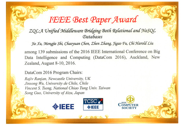 2016年8月在新西兰奥克兰举行的IEEE大数据智能和计算国际会议(IEEE International Conference on Big Data Intelligence and Computing)上,软件学院刘驰教授及其团队的论文“ZQL: A Unified Middleware Bridging Both Relational and NoSQL Databases”,在139篇投稿中脱颖而出,获得本次会议唯一最佳论文奖。此项荣誉是刘驰老师及其研究团队在物联网大数据领域长期努力的结果,是对该团队研究与学术水平的肯定。