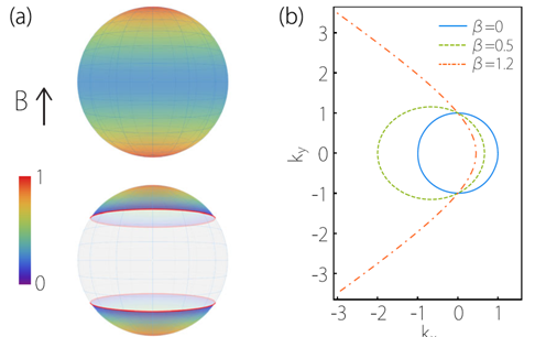 图1:(a)朗道能级压缩因子随能量倾斜与磁场夹角的变化行为。(上):传统外尔点,(下):第二类外尔点,其中红线表示出现朗道能级坍塌的临界角。(b)磁场下电子的半经典轨道随磁场方向变化的演化行为。轨道由封闭变为开放对应于体系从具有良好定义的朗道能级到朗道能级的坍塌(外尔模型下的描述)。