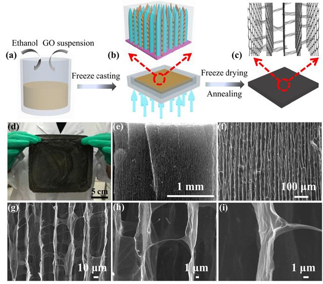 VA-GSM制备过程大致如图1a-c:在7 mg·mL-1的GO溶液中混入少量乙醇(GO:ethanol = 30:1)形成混合溶液,再将溶液倒入一定尺寸的PTFE模具中,将该模具放入液氮中进行单轴定向冷冻,利用冰晶生长形成长程有序的垂直排列结构,将该结构进行干燥、煅烧,最终便得到VA-GSM,其SEM见图1d-i。另外,该种方法得到的样品宏观尺寸大小可以根据模具的尺寸进行相应的调整。