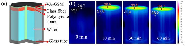 采用在装满水的玻璃容器上放置聚苯乙烯泡沫,上面铺上一层玻璃纤维,然后最顶部放上VA-GSM,在光照的情况下,检测顶部温度的变化,以及检测水蒸气的出现,证明该装置确实能对太阳能水蒸发起到高效的作用(热传导率可达到3.8 mW·m−1·K−1)。此外,用于海水净化中,吸收后对净水离子进行吸收检测,其含量低于世界卫生组织WHO规定值,而且比传统的一些净水装置净水效果高出很多(如图3)。