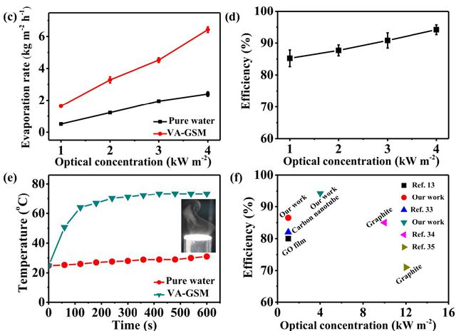 经过测试,该膜分别在一个光源和四个光源的情况下,水的蒸发率能达到1.62 kg· m-2·h-1和6.25 kg·m-2·h-1,其太阳能转换率分别可达到86.5%和94.2%,这比以往报道过的大多数碳材料的太阳能转化率都要高。而这种用途对于缓解水资源危机起到了很好的作用,它可以将不同来源的水(海水、废水以及浓酸、浓碱溶液)高效快速地转化为净水。在之前相关方面的研究中,采用的材料为3D阳极氧化铝膜、聚吡咯沉积不锈钢网、基于金纳米颗粒薄膜的无尘纸等,它们不能在有机、强腐蚀性酸和强碱等恶劣环境中使用,因此不能实现产业的规模化。而文中得到的VA-GSM材料具有高孔隙率、高吸光率,而且在恶劣环境中也能够稳定存在(能承受3000 oC的高温以及-196 oC的低温),优势十分明显。