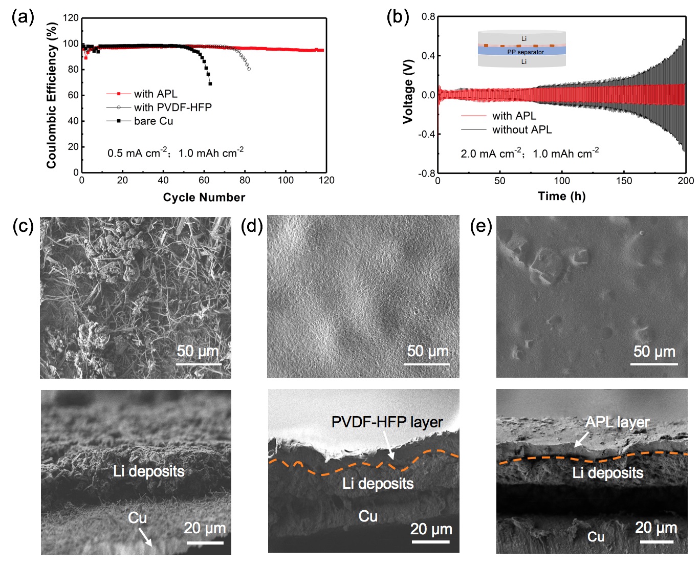 Li-Cu半电池和Li-LFP全电池循环测试结果及相关锂沉积形貌差异