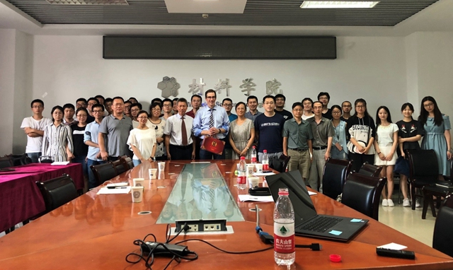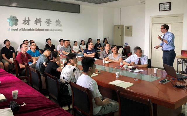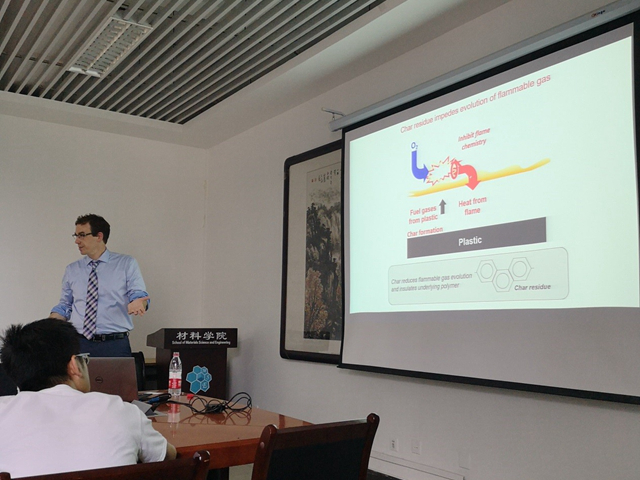 7月25日,麻省大学Amherst校区国家高分子研究中心的Todd Emrick教授来我校材料学院作题为《Reducing Polymer Flammability with New Designer Synthetic Materials》的讲座。新型本质阻燃聚合物的合成是Todd Emrick教授课题组的研究方向之一,在不需要添加含卤阻燃剂或者无机阻燃剂的情况下就可以达到理想的阻燃级别。教授凭借其渊博的专业知识和风趣幽默的讲授风格,深入浅出地讲述了羟基、环氧基和双键在生物基高聚物中的结合及相应的阻燃效果,吸引了众多感兴趣的师生们,会议室内座无虚席。