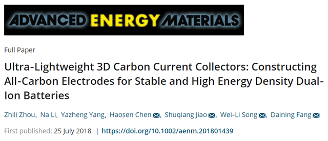 (IV) Peng Wang, Haosen Chen,* Na Li, Xinyi Zhang, Shuqiang Jiao,* Wei-Li Song,* and Daining Fang. Dense graphene papers: Toward stable and recoverable Al-ion battery cathodes with high volumetric and areal energy and power density. Energy Storage Materials, 2018, 13: 103–111.