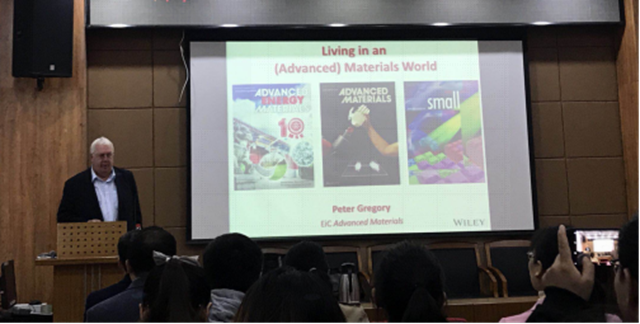 Dr.Peter Gregory简要介绍了《Advanced Materials》及其姊妹刊的发展历程及现状、世界各地在《Advanced Materials》期刊的投稿及稿件录用情况,充分肯定了中国科研工作者在学术界的贡献和地位,还高度赞赏了德赢AC米兰官网材料研究及发表Wiley期刊文章。此外,他还推介了Wiley旗下的新期刊《Advanced Healthcare Materials》《 Advanced Energy Materials》和《Advanced Optical Materials》,并从编辑的角度详细介绍了稿件初筛、送审、裁定过程的编辑原则,以及投稿注意事项、如何提高论文投稿的命中率和扩大文章学术界的影响力。