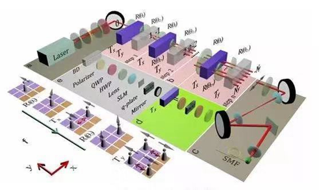 课题组在搭建适用于观察拓扑界面态的二维量子行走系统过程中,使用光的轨道角动量和空间位置两个自由度来映射出量子行走系统的二维位置空间。利用定制的具有多个图案的q-plate和双折射晶体,可以分别实现在光的轨道角动量和空间位置上有条件平移操作;配合半波片实现偏振旋转操作,从而在实验上就实现了二维量子行走。